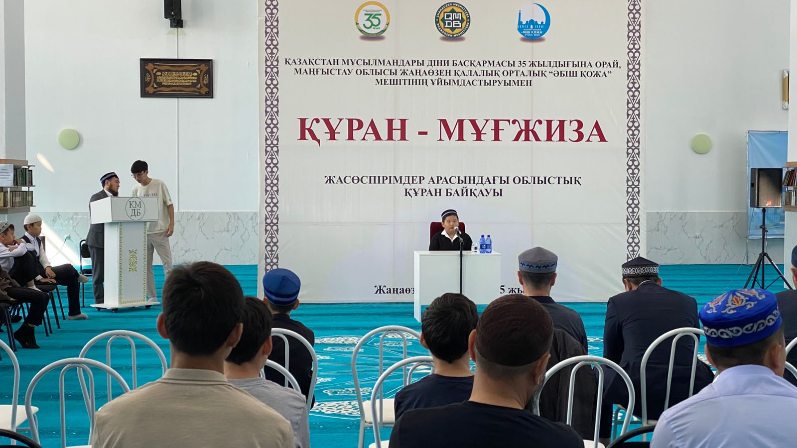 Қазақстан мұсылмандары діни басқармасының 35 жылдығына орай, Жаңаөзен қаласы орталық “Әбіш қожа” мешітінің ұйымдастыруымен “Құран-Мұғжиза” атты Құран Кәрімнің 28- 29-30 параларын жатқа және мәнерлеп оқудан облыстық Құран жарысы өтті.