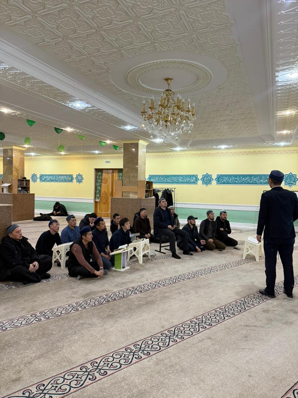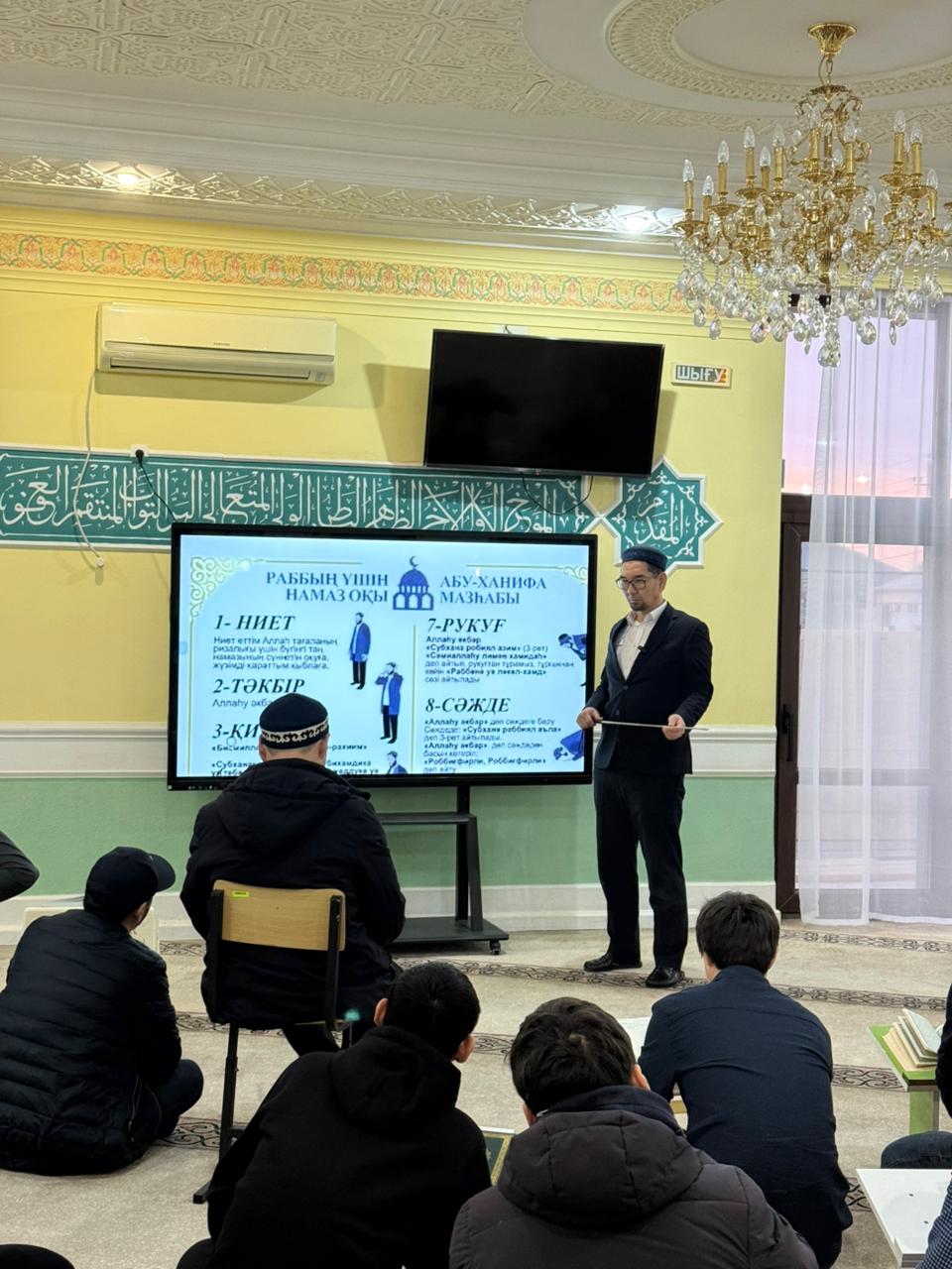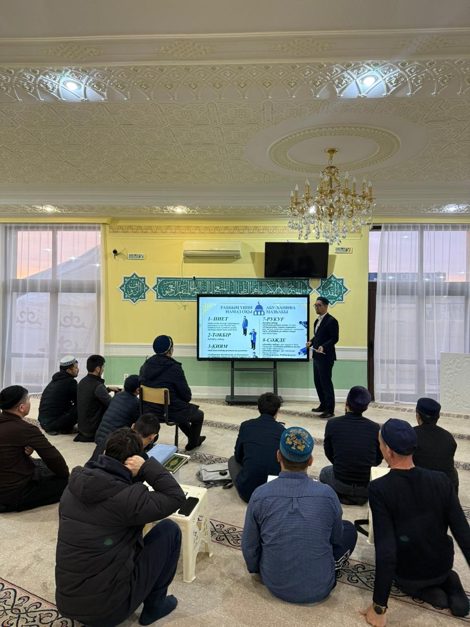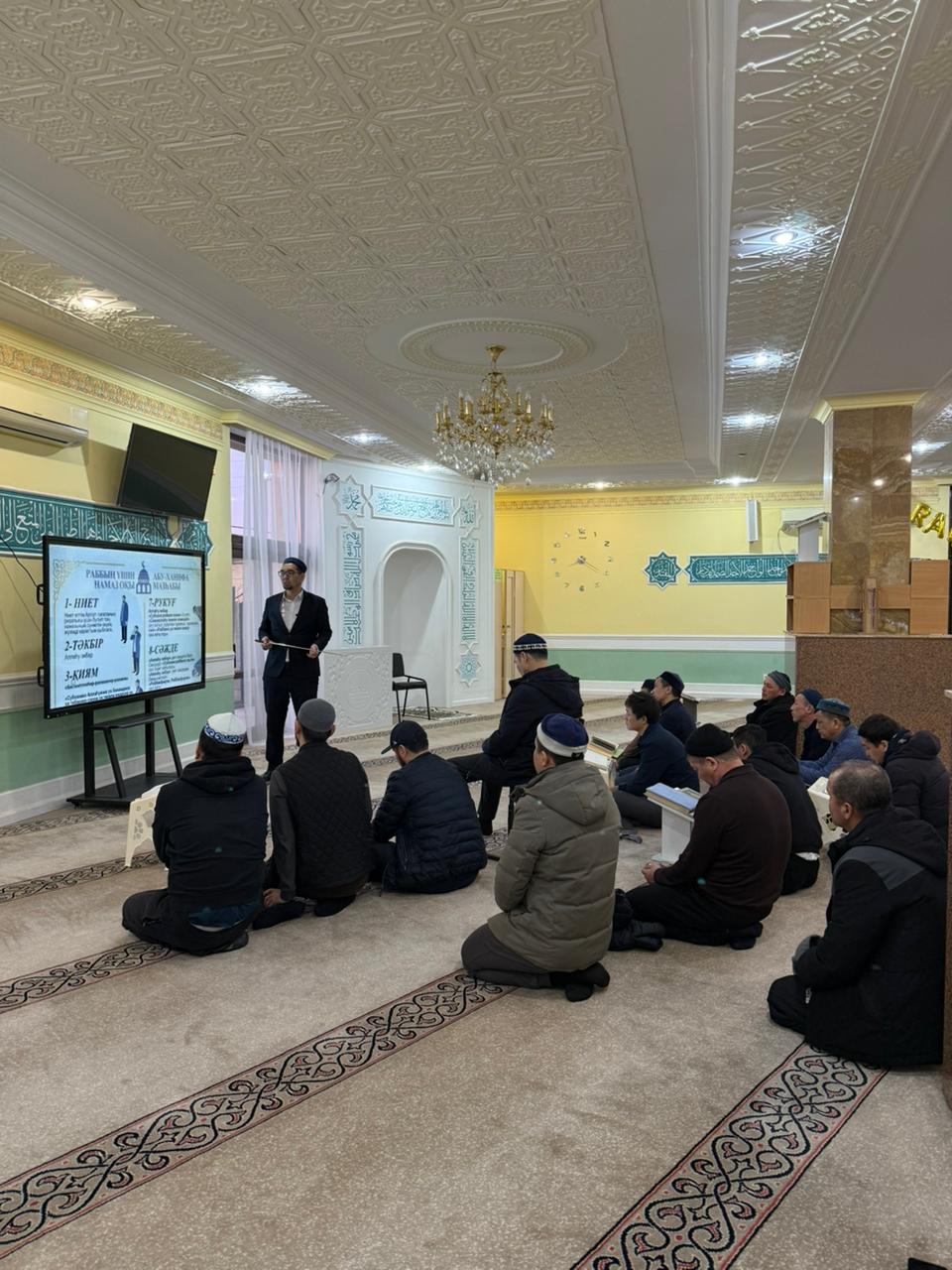 Оқу-ағарту бағыты аясында өткен дәрісті мешіт бас имамы Юнус Қадырқұлұлы жүргізіп,ханафи мәзһабы бойынша намаздың оқылу тәртібі теориялық әрі практикалық түрде түсіндірілді. Дәріс барысында намаздың парыз, уәжіп және сүннет амалдары кеңінен баяндалып, құлшылықтың дұрыс орындалуына қатысты маңызды мәселелерге тоқталды.