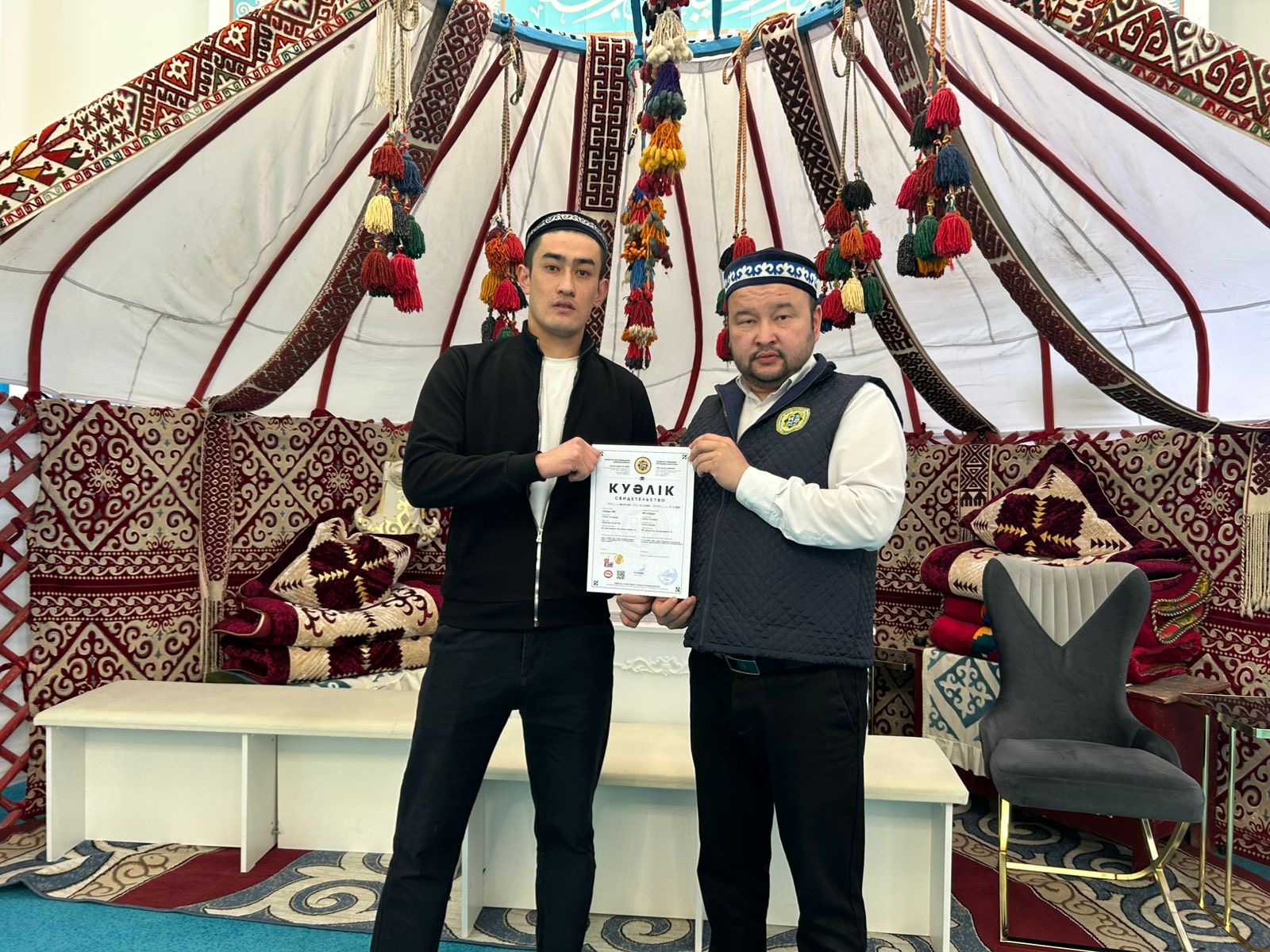 Сертификатты ҚМДБ Халал даму бөлімінің өңірдегі жауапты маманы Іздібай Бегенұлы табыстады. Аталған сертификат тамақтану орнында ұсынылатын өнімдердің халал талаптарына толық сәйкес екенін айғақтайды.