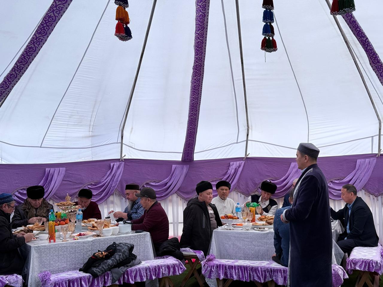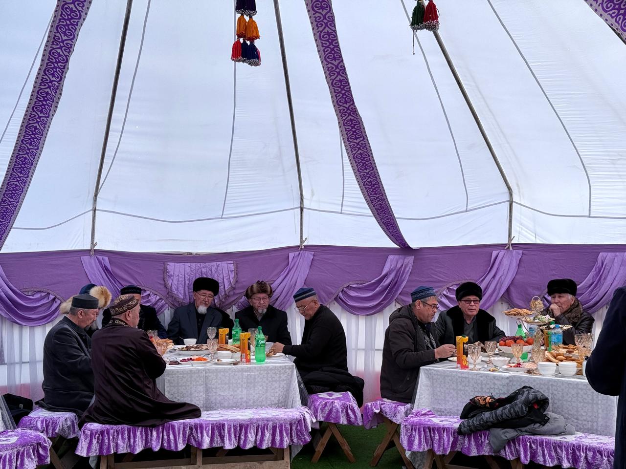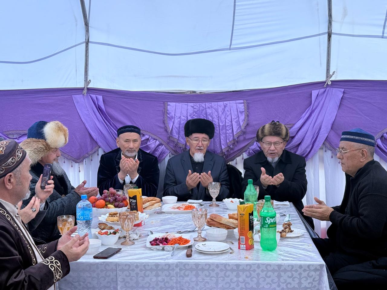 Сондай-ақ жиын соңынан мешіт ауласына ақ қазақы үй тігіліп,дәстүрлі ақ дастархан жайылып,ақсақалдар  ас үстінде бас қосты. Ал, ақсақал қарияларымыз  еліміздің амандығы үшін дұға жасады.