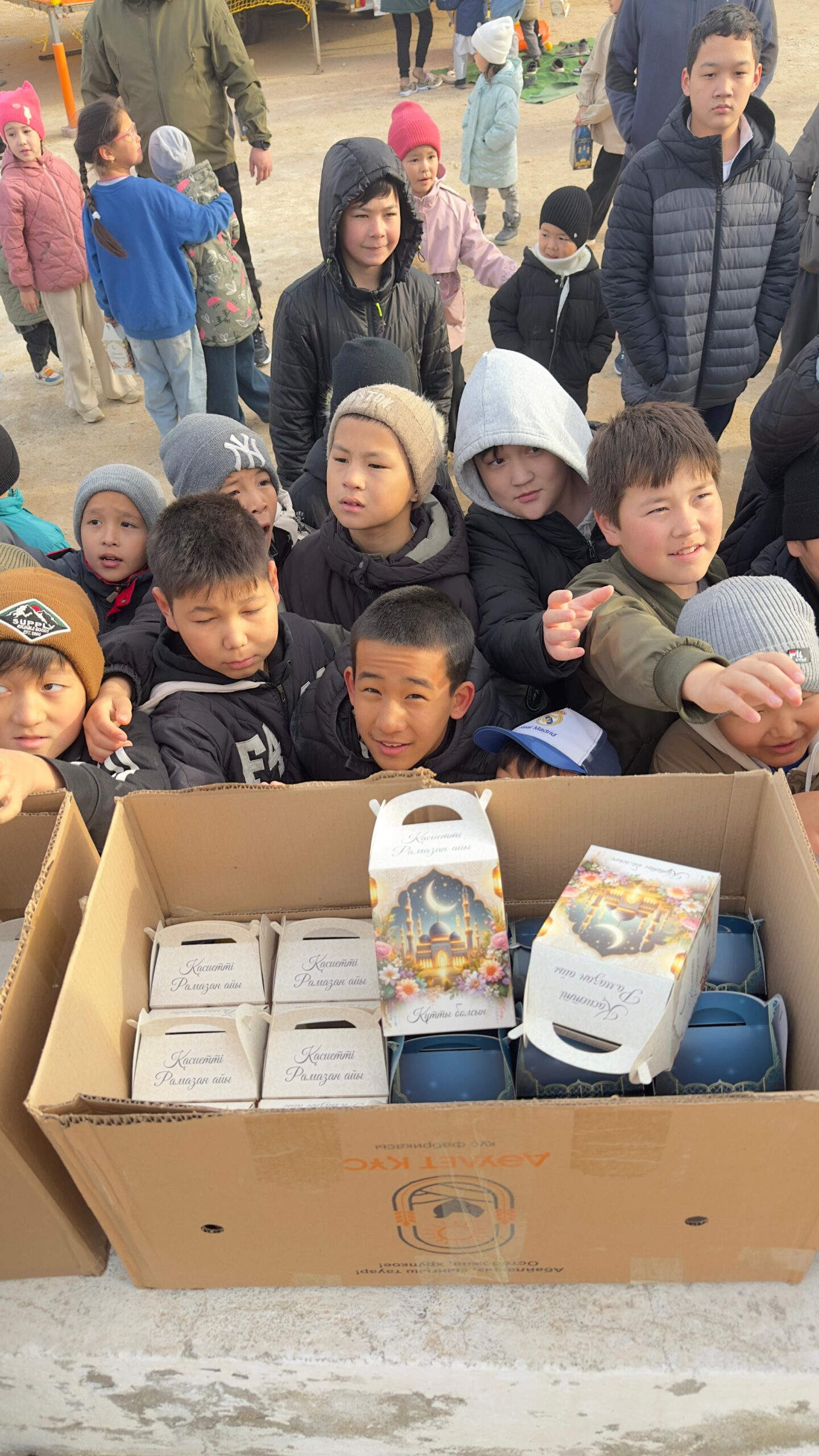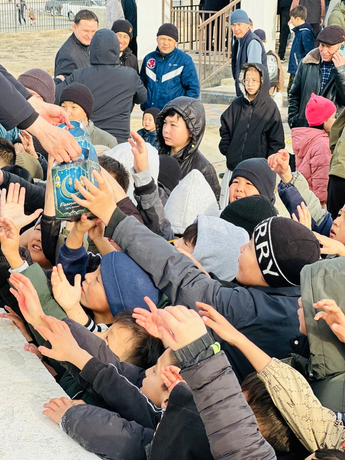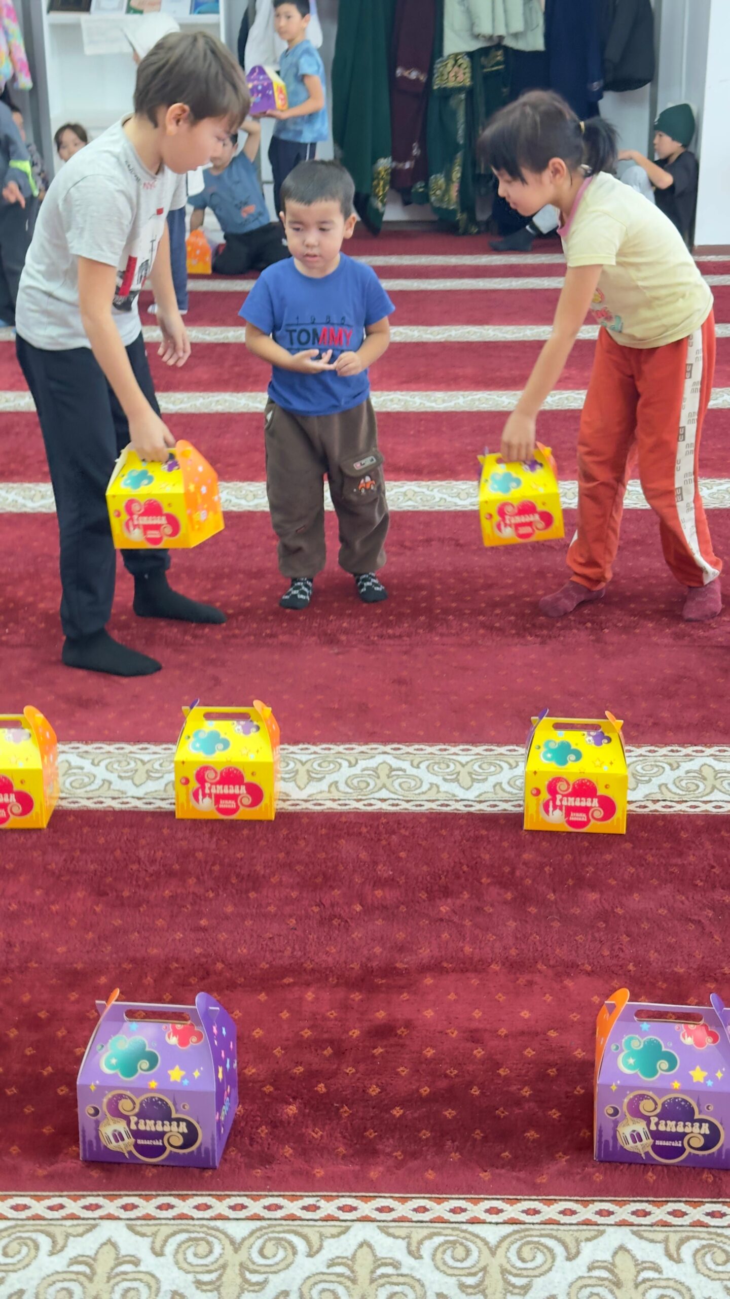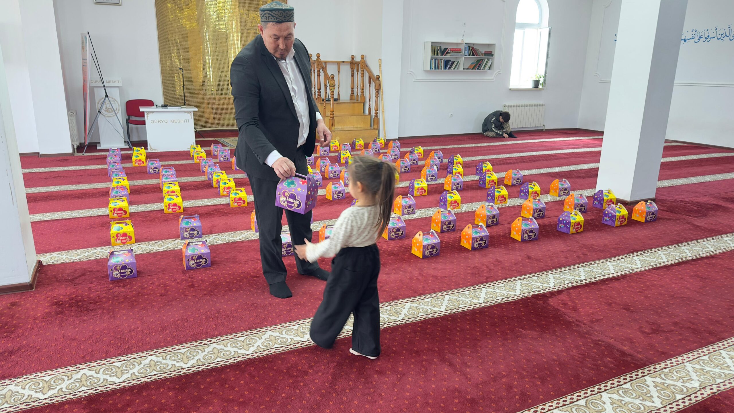Айт күні мешіт ауласында 150 балаға тәттілер таратылып, бүлдіршіндерге қуаныш сыйланды. Сонымен қатар, арнайы ойын батуттары орнатылып, балалардың еркін ойнап, мерекелік көңіл-күйді сезінуіне жағдай жасалды.