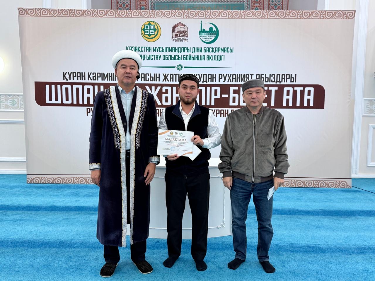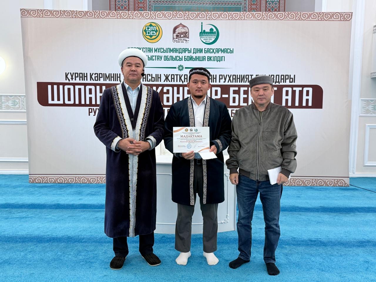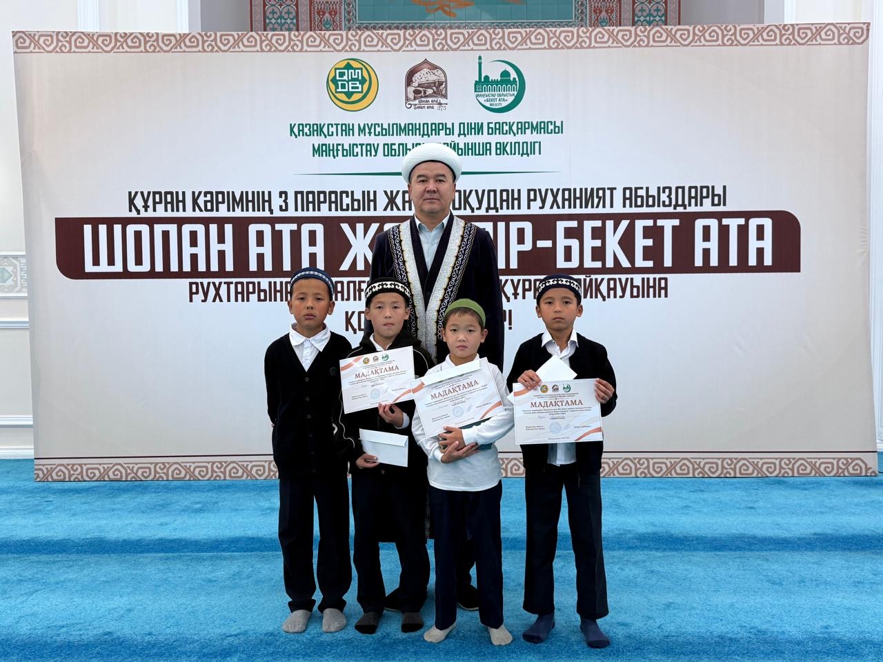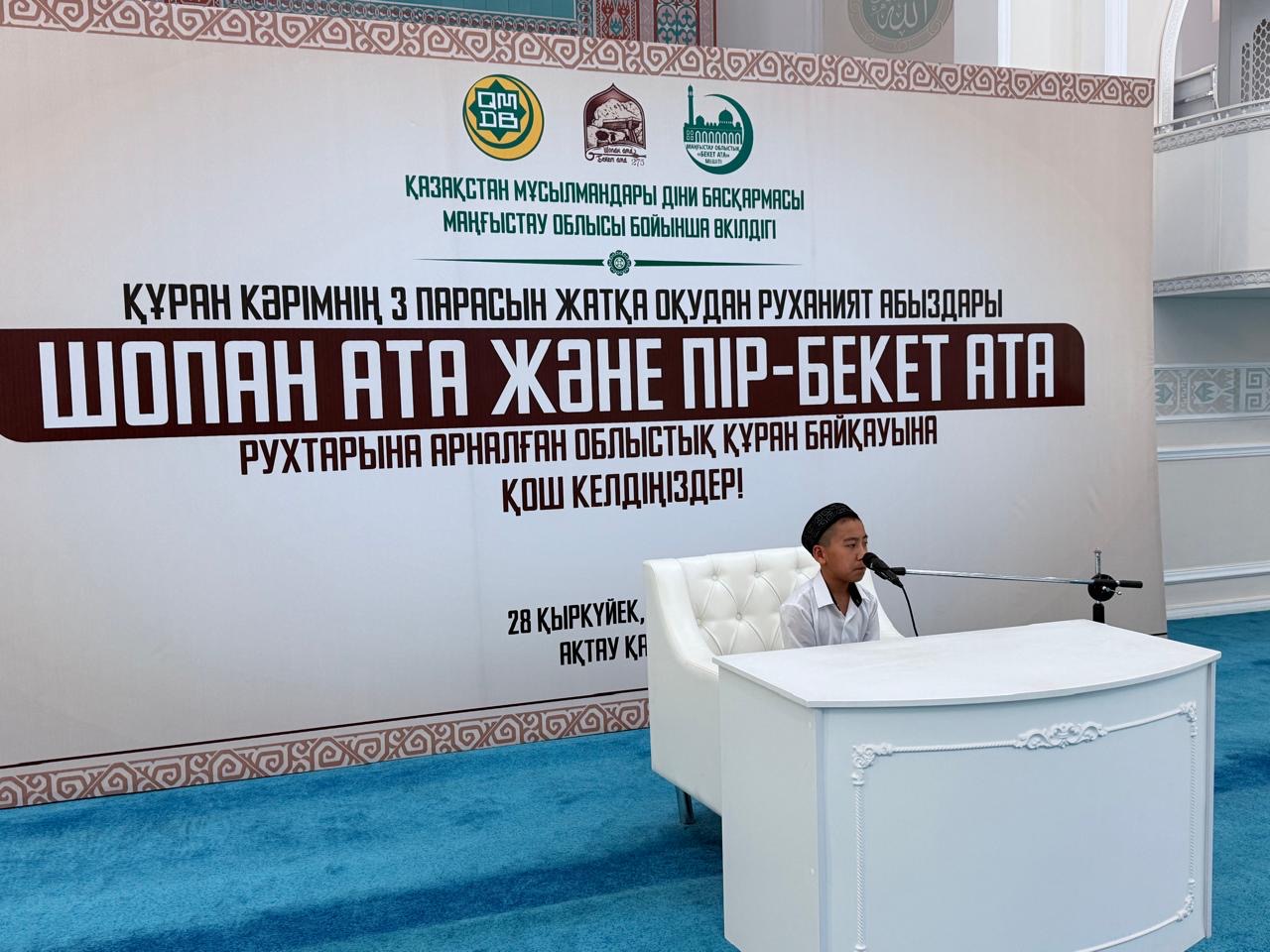 ҚМДБ Маңғыстау облыстық өкілдігінің ұйымдастыруымен Шопан ата және Пір-Бекет атаның туғанына 275 жыл толуына орай,қасиетті Құран Кәрімнің үш парасын жатқа оқудан ұл балалар арасында облыстық байқау өтті.